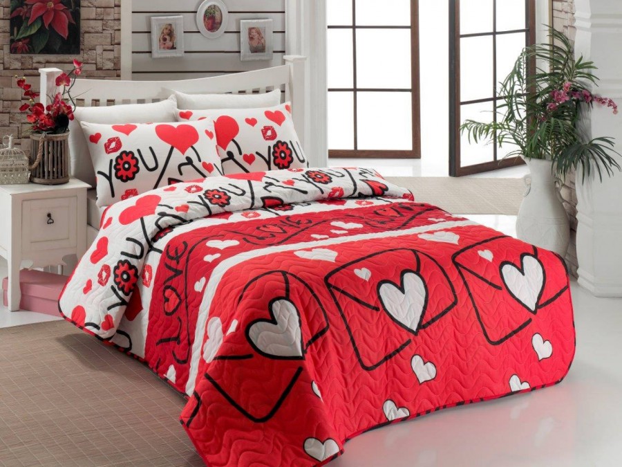 Set cuvertura matlasata 200x220cm+ 2 fete perna 50x70cm Lovestory - Red